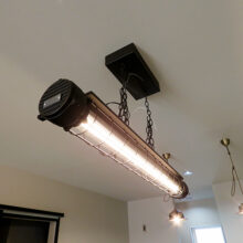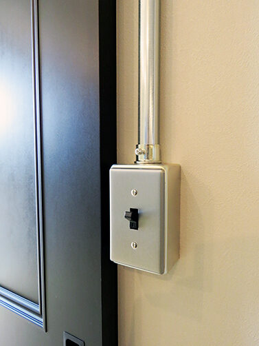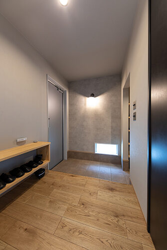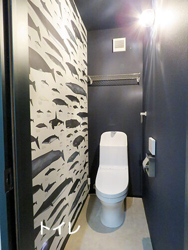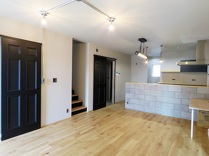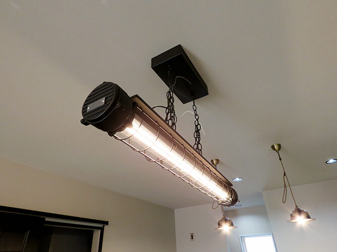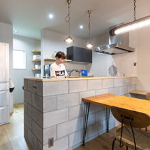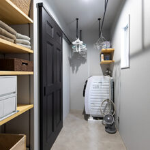 LDKを見渡すと、少し違和感さえ覚えるコンクリートブロックと露出配管が目を引く。“パチッ”という音が小気味いいアメリカンスイッチ、ヴィンテージ風の照明器具、無機質なワイヤーラックetc…古い工場や倉庫をイメージし、それぞれに存在感があるアイテムを厳選。シンプルな長方形の中に、やりすぎ感のないインダストリアル空間と、日々の負担を軽減するための動線を納め、お気に入りに囲まれた心地いい暮らしを実現