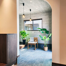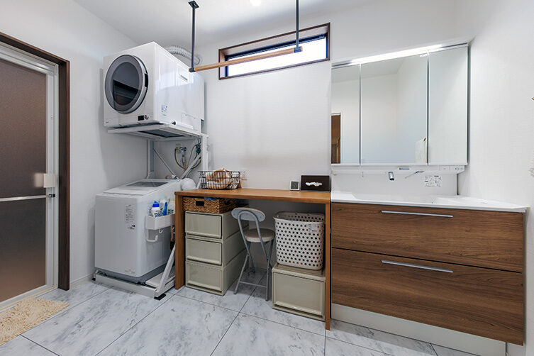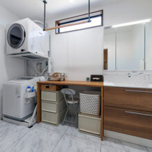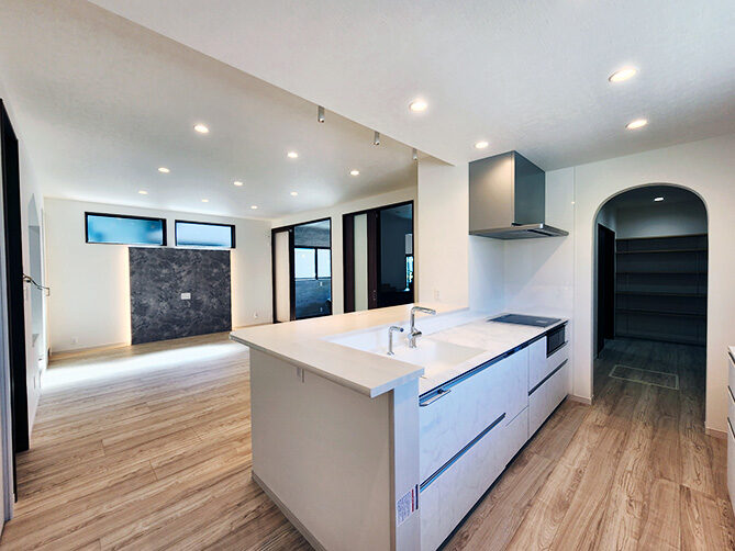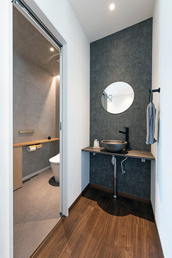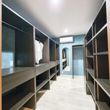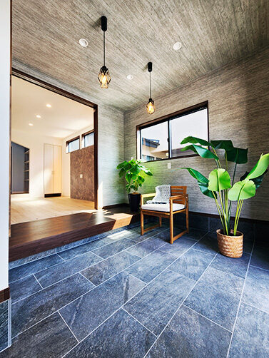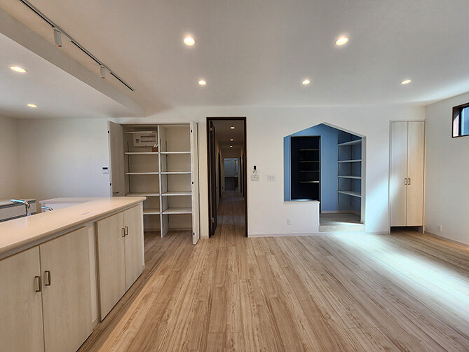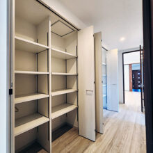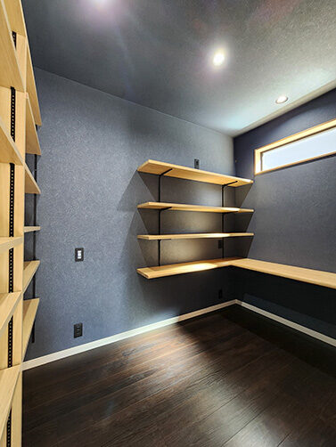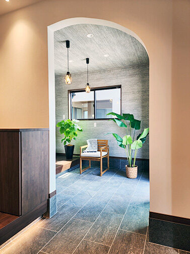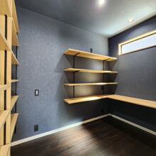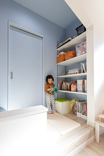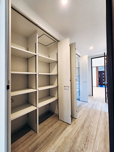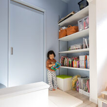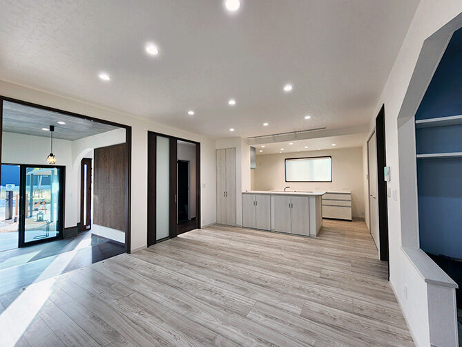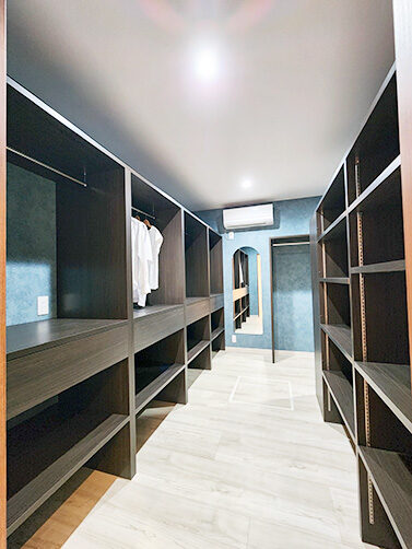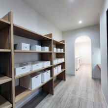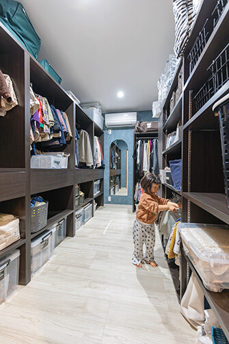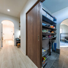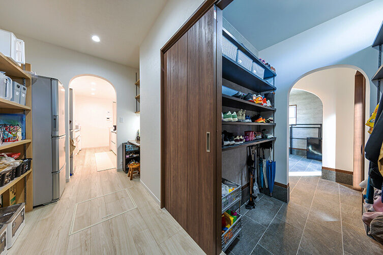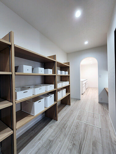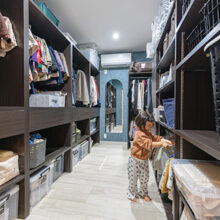階段の上り下りが必要ないワンフロアの生活。玄関からの移動はメインルート以外に、来客用・生活用と2つの動線を確保。玄関ポーチ直結の土間リビングでは、靴のまま気軽に来客をもてなしたり、家族と過ごす時間も有意義にしてくれる。買い物帰りには、パントリー内に食材や日用品をしまいながらキッチンまでアクセスでき“家事ラク”と“隠す収納”が両立。リビング内ヌックの奥には隠し部屋(書斎)がある。家族一人一人のスペースがある収納スペースは、まるでプロスポーツのロッカールームのよう